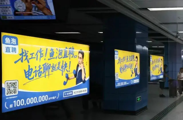 其一,这是让企业,尤其是大企业的总部,能直接看到鱼泡直聘的直接方式。“这些公司的老板和HR没法像看到线上广告一样划走,而是日常在写字楼、地铁站里被强制触达,那他们就有可能来我们这招人。”