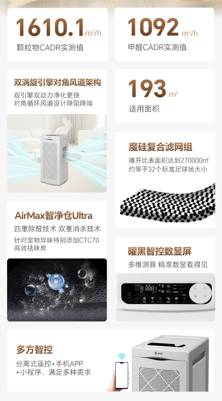 双涡旋引擎,动力持久输出:采用双电机双动力设计,相比单电机净化器,动力更强劲且散热更均匀,长期高负荷运行也不易出现“动力下降”。即便24小时开机净化193㎡的大空间,颗粒物CADR值仍能稳定维持在1610.1m³/h、甲醛CADR值1092m³/h,不会因运行时间过长导致净化速度变慢;